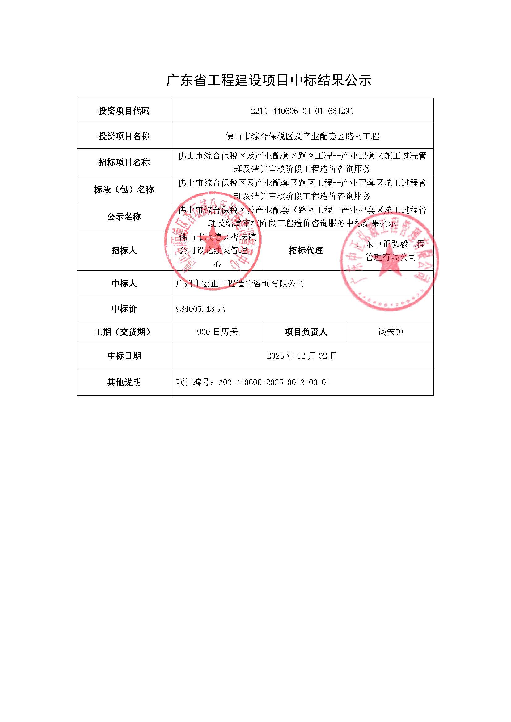 佛山市综合保税区及产业配套区路网工程--产业配套区施工过程管理及结算审核阶段工程造价咨询服务中标结果